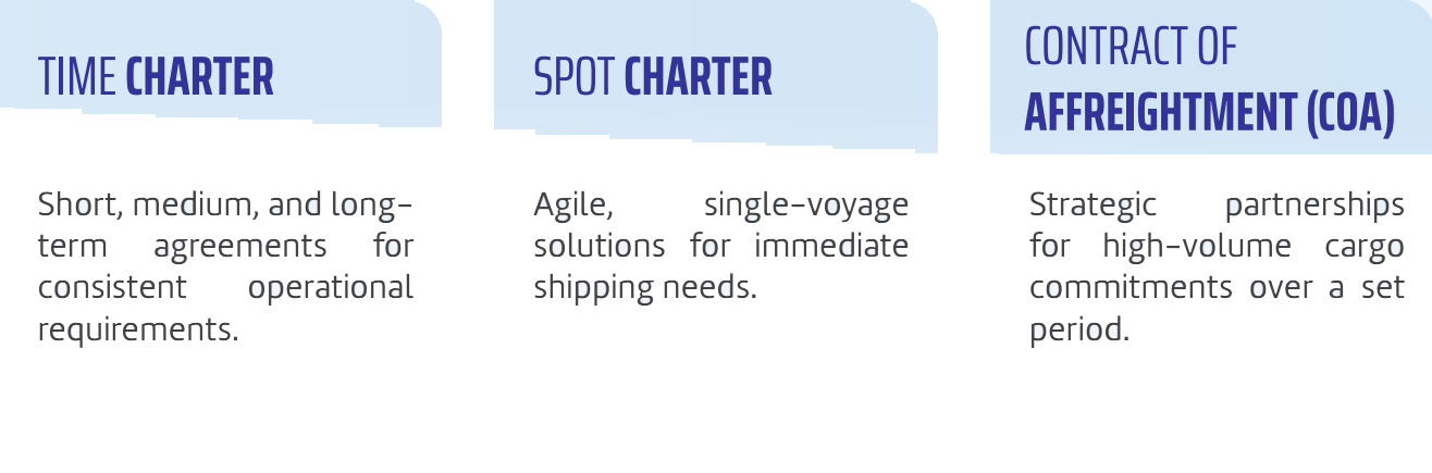 We provide a versatile range of chartering terms tailored to meet the dynamic needs of our clients.